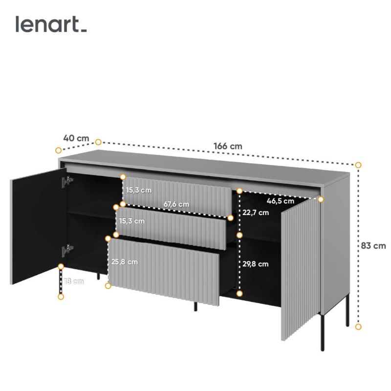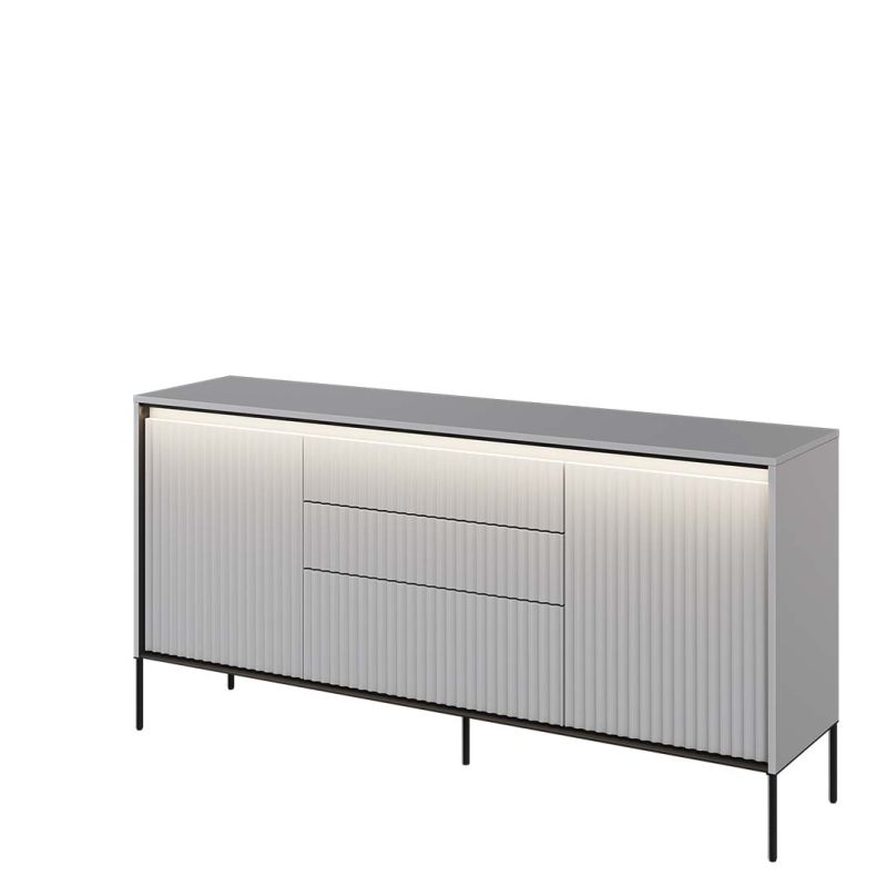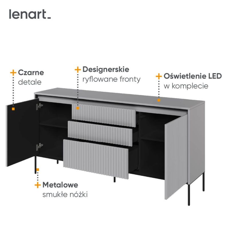 Mebel oferuje praktyczne rozwiązania, które ułatwiają codzienne użytkowanie. Trzy pojemne szuflady z systemem push-open oraz dwie zamykane szafki z półkami zapewniają dużo miejsca na przechowywanie – od dokumentów, przez tekstylia, aż po dekoracje. Dodatkowym atutem jest oświetlenie LED, które nadaje komodzie subtelnego, nowoczesnego wyrazu i podkreśla jej designerski charakter.