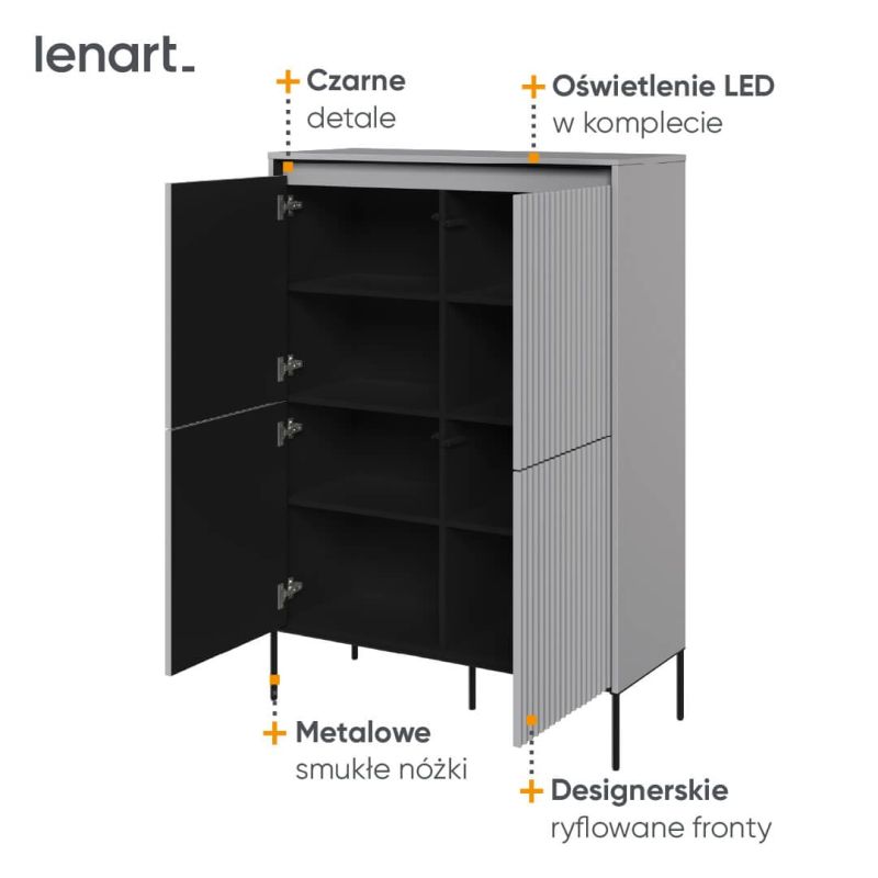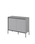 Korpus oraz fronty wykonano z płyty meblowej i płyty MDF wykończonych laminatem, co zapewnia trwałość oraz łatwość pielęgnacji w codziennym użytkowaniu. Metalowa podstawa zwiększa stabilność konstrukcji, a delikatne fazowanie krawędzi podkreśla dopracowanie detali. Pionowa struktura frontów nadaje komodzie wyrazisty, nowoczesny charakter.