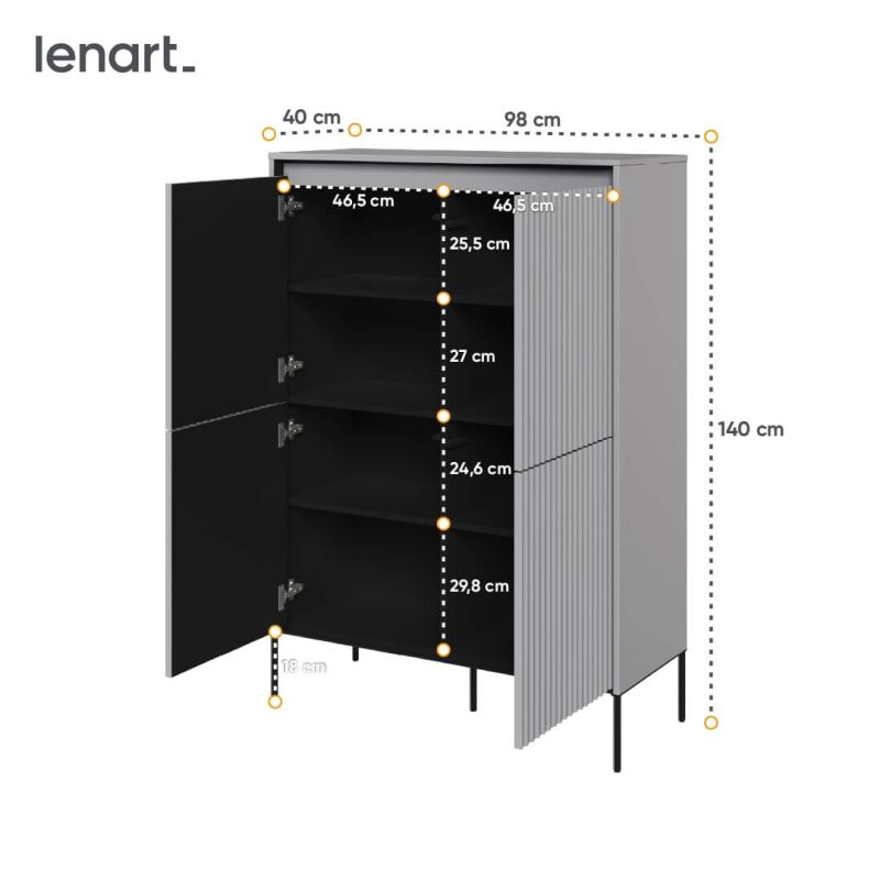 Wymiary mebla: szerokość 98 cm, wysokość 139,9 cm, głębokość 40 cm. Waga: 56 kg. Komoda przeznaczona jest do samodzielnego montażu. Dzięki smukłym proporcjom doskonale sprawdzi się zarówno w mniejszych pomieszczeniach, jak i w bardziej przestronnych aranżacjach, oferując dużą funkcjonalność i estetyczny wygląd.