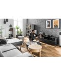Fronty wykonane w 100% z litego dębu podkreślają szlachetny charakter mebla oraz jego ponadczasowy styl. Zewnętrzny korpus pokryto naturalną okleiną dębową z dodatkiem elementów litego drewna, co zapewnia spójność wizualną i wysoką odporność na codzienne użytkowanie. Wnętrze komody wykończone zostało płytą laminowaną w dekorze dąb tajga, gwarantującą trwałość i łatwość utrzymania czystości.
