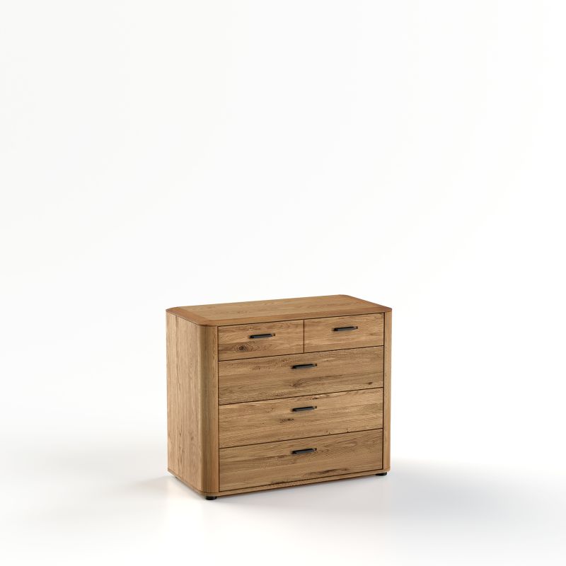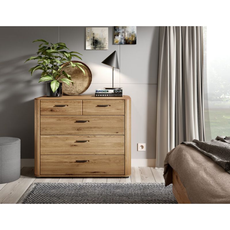 Komoda MONA.094.14 to połączenie naturalnego piękna litego drewna dębowego z nowoczesną funkcjonalnością. Zaprojektowana z myślą o sypialniach, w których liczy się zarówno estetyka, jak i praktyczne rozwiązania, stanowi elegancki i trwały element wyposażenia wnętrza.