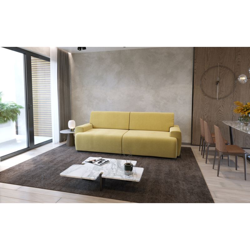 Pod powierzchnią kryje się podwójne sprężynowanie, które zapewnia wyjątkową elastyczność i trwałość – siedzisko i powierzchnia spania zachowują wysoki komfort nawet przy codziennym użytkowaniu. Dzięki funkcji spania sofa w kilka chwil zamienia się w wygodne łóżko o wymiarach 160 × 200 cm, zapewniając komfortowy odpoczynek o każdej porze dnia.
