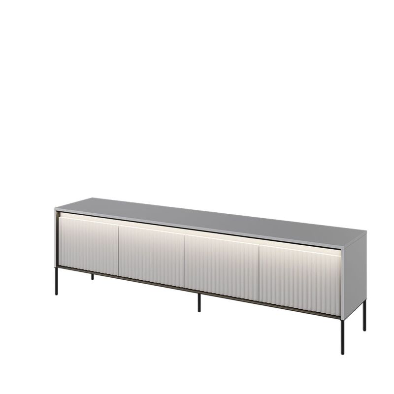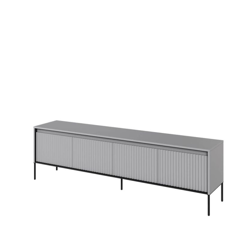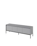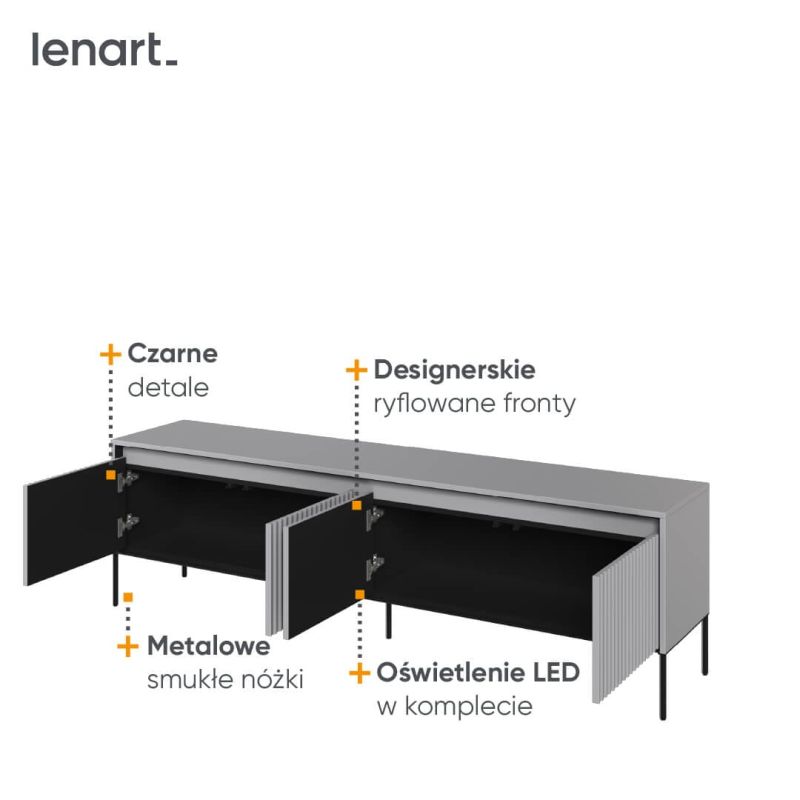 Szafka RTV Trend to niska, wydłużona bryła zaprojektowana jako praktyczna podstawa pod telewizor oraz sprzęt multimedialny. Prosta forma mebla w połączeniu z pełnymi frontami, pionowymi podziałami oraz delikatnie fazowanymi detalami nadaje całości uporządkowany, oszczędny charakter, który dobrze wpisuje się we współczesne aranżacje salonu lub pokoju dziennego.