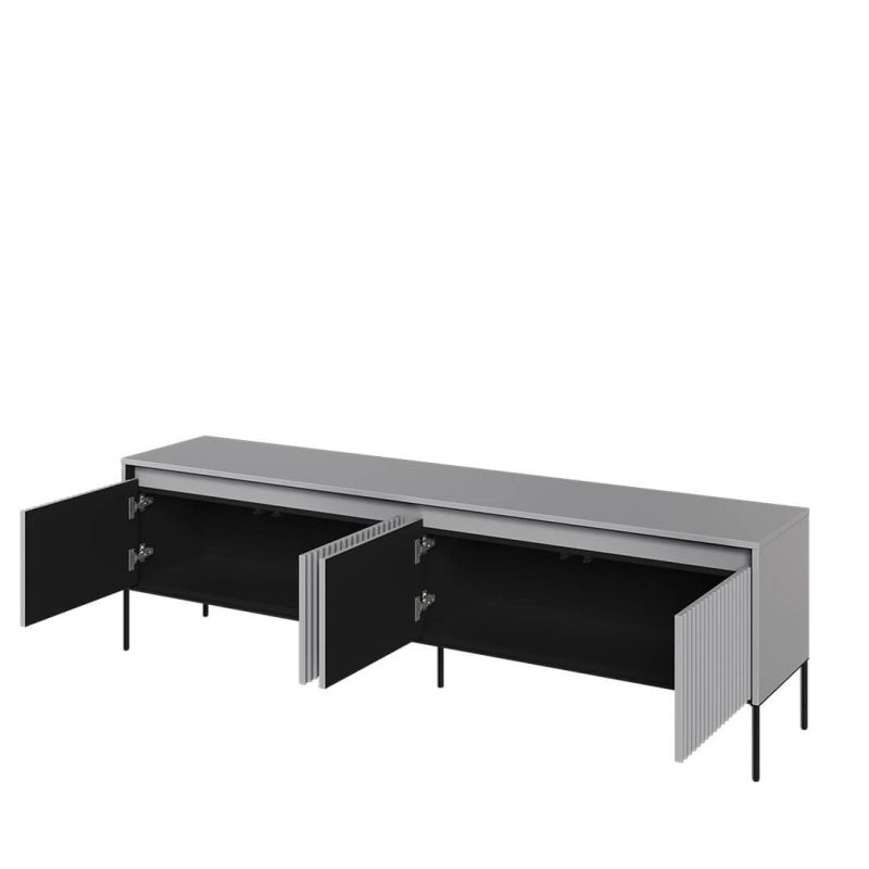 Korpus oraz fronty wykonano z płyty meblowej i płyty MDF, wykończonych laminatem, co zapewnia trwałość oraz łatwość pielęgnacji w codziennym użytkowaniu. Zastosowanie metalu w elementach konstrukcyjnych i nóżkach wzmacnia stabilność mebla i zapewnia pewne podparcie dla sprzętu multimedialnego.