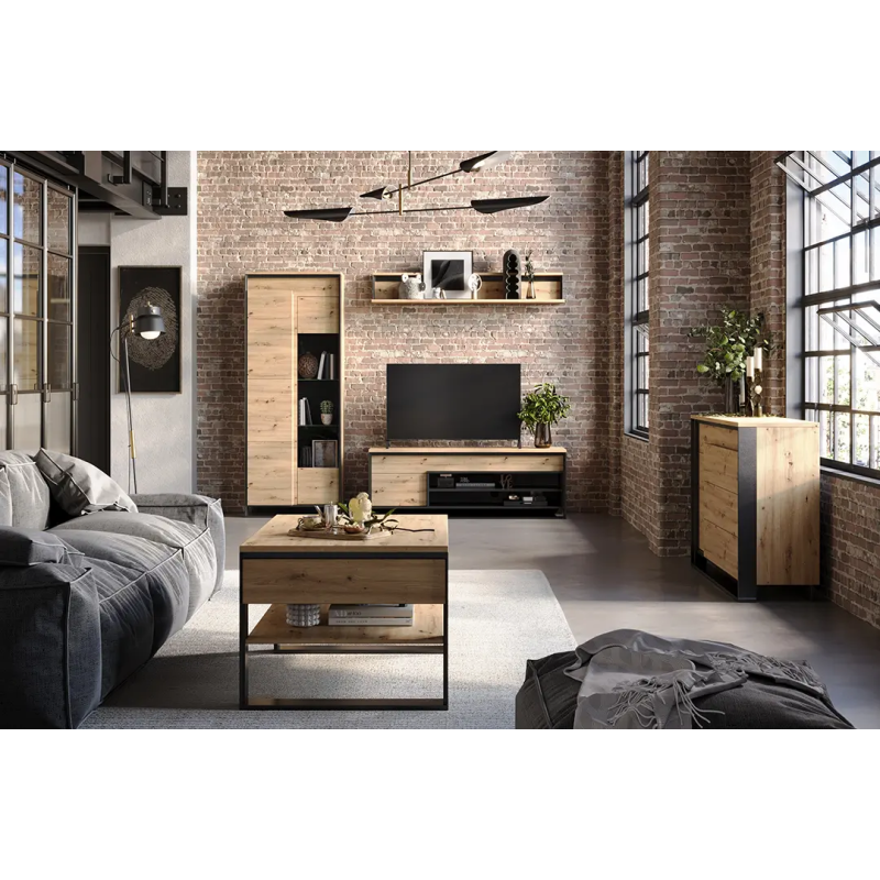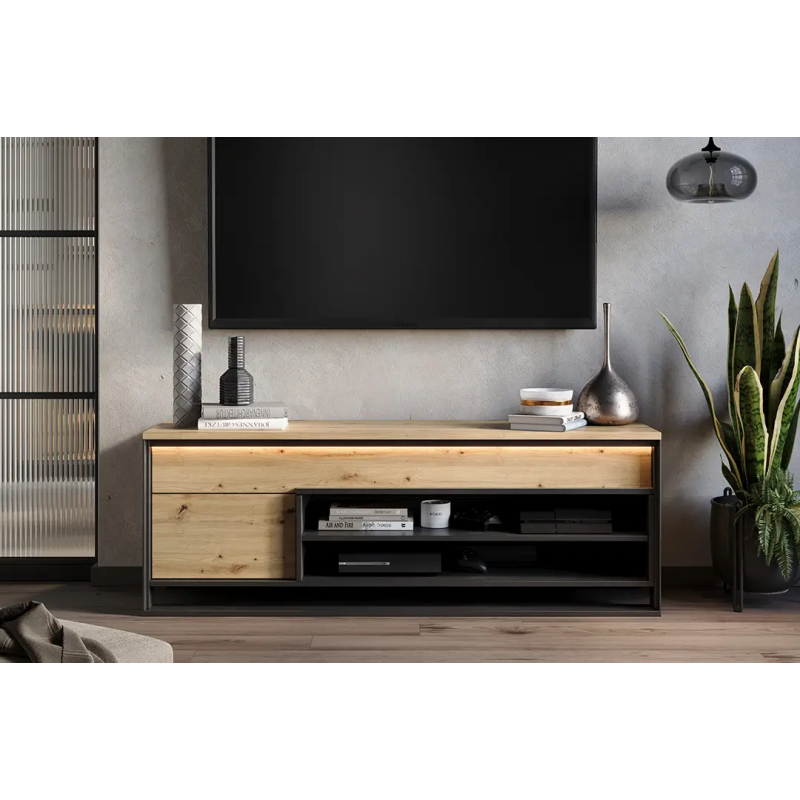Model posiada jedne drzwi, jedną szufladę oraz otwartą półkę, co pozwala na funkcjonalne rozdzielenie przechowywanych przedmiotów. Podwójna szuflada ukryta pod jednym frontem ułatwia organizację drobnych akcesoriów, natomiast otwarta przestrzeń i półka zapewniają szybki dostęp do sprzętu RTV oraz urządzeń używanych na co dzień.