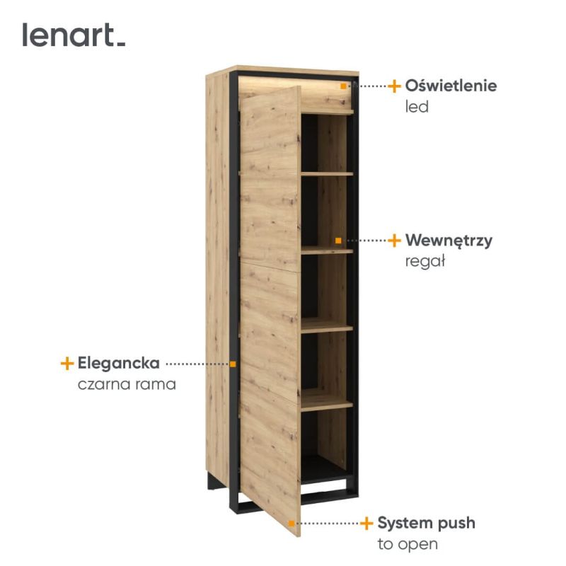 Szafa Quant to kompaktowy mebel zaprojektowany z myślą o wnętrzach, w których liczy się porządek oraz efektywne wykorzystanie przestrzeni. Jednodrzwiowa bryła o szerokości 60 cm i głębokości 41 cm sprawdzi się zarówno w salonie, sypialni, jak i w węższych strefach komunikacyjnych. Trójwymiarowy front w połączeniu z bezuchwytowym systemem push to open podkreśla nowoczesny, minimalistyczny charakter mebla.