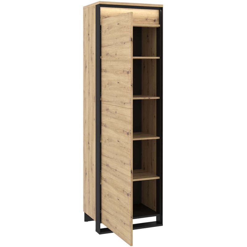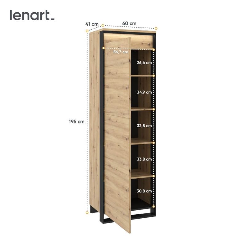 Za uchylnymi drzwiami znajduje się cztery funkcjonalne półki, które umożliwiają wygodne przechowywanie złożonej odzieży, tekstyliów lub akcesoriów. Wysokość 195 cm pozwala maksymalnie wykorzystać przestrzeń w pionie, oferując dużą pojemność przy zachowaniu smukłej sylwetki szafy.