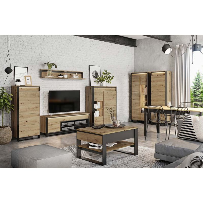 Korpus wykonano z laminowanej płyty wiórowej, natomiast front z płyty wiórowej z dekoracyjnym elementem z płyty MDF. Zastosowane materiały są łatwe w pielęgnacji i odporne na codzienne użytkowanie. Dekoracyjna listwa LED umieszczona na froncie jest elementem standardowym, który podkreśla nowoczesny charakter szafy i zwiększa komfort korzystania z niej po zmroku.