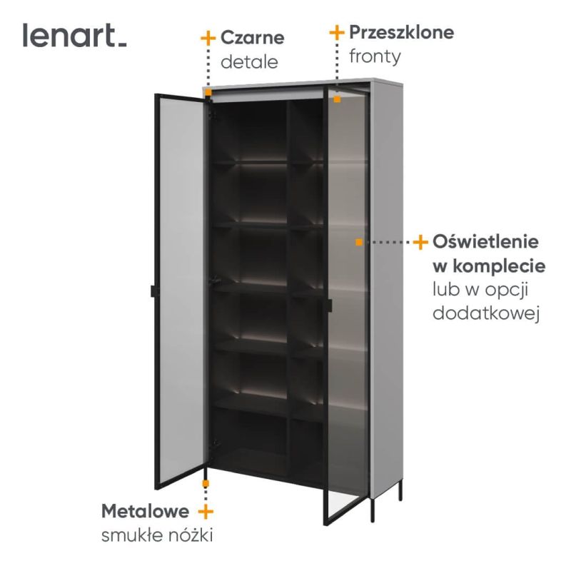 Witryna przeznaczona jest do samodzielnego montażu, co ułatwia transport i ustawienie w docelowym miejscu. Doskonale sprawdzi się w salonie, jadalni lub gabinecie jako połączenie estetycznej ekspozycji z funkcjonalnym miejscem do przechowywania.
