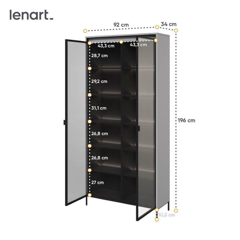 Wymiary mebla: szerokość 92 cm, wysokość 196 cm, głębokość 34 cm. Smukła forma zapewnia dużą powierzchnię ekspozycyjną przy niewielkim zajęciu przestrzeni w głąb pomieszczenia, co ułatwia ustawienie witryny przy ścianie lub w węższych wnękach.