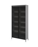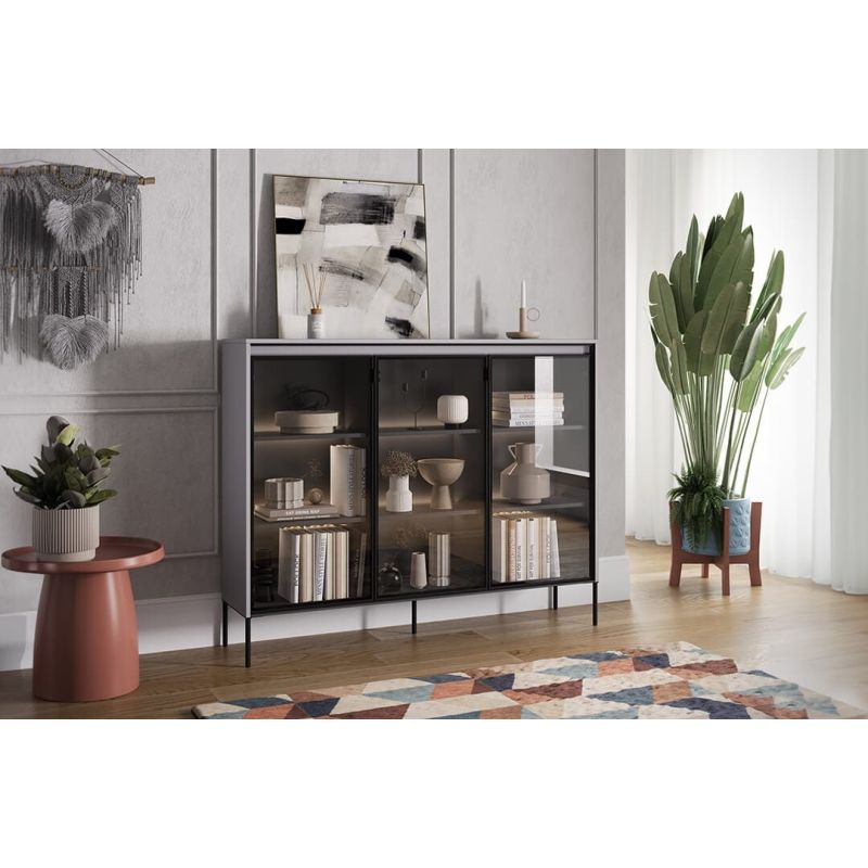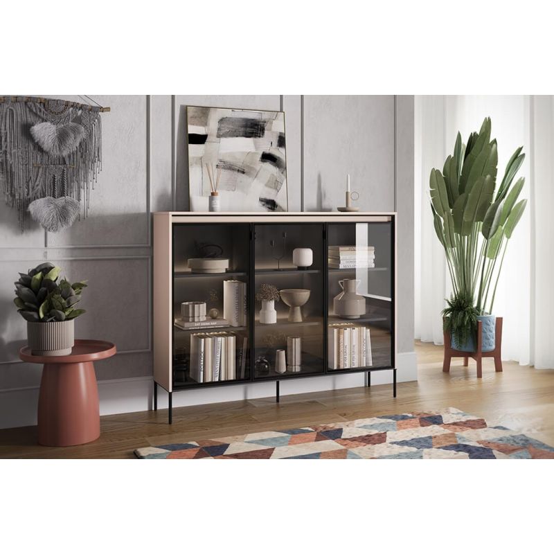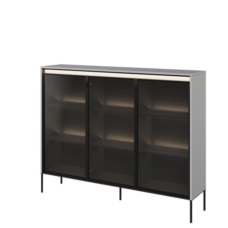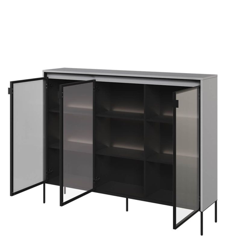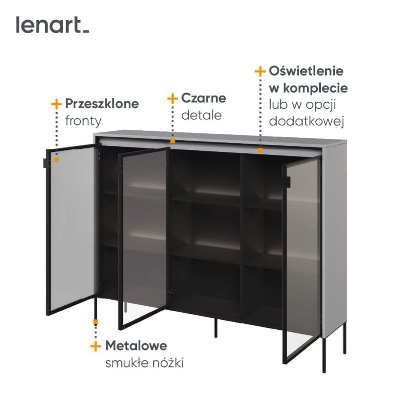 Trzy przeszklone fronty pozwalają wyeksponować zawartość witryny, jednocześnie chroniąc ją przed kurzem. Uchylne drzwi, otwierane na lewą i prawą stronę, zapewniają komfortowe użytkowanie i możliwość dopasowania sposobu otwierania do ustawienia mebla. Wnętrze podzielone na trzy szafki z licznymi półkami umożliwia czytelną organizację zastawy stołowej, szkła lub kolekcji dekoracyjnych.