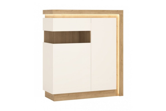 • Praktyczny stolik w kolorze Dąb Riviera Jasny (blaty, bok, podstawa) oraz Biały Alpejski (przegroda)